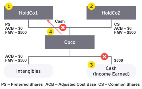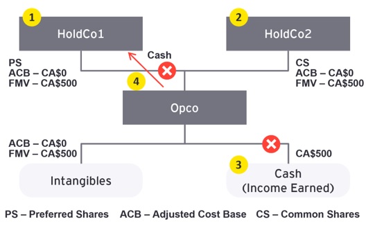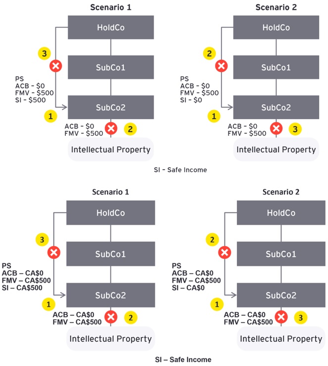 Following the redemption of the preferred shares, the CRA's view is that the CA$500 balance of safe income would still contribute to the inherent capital gain on the common shares provided the intangible asset still has a FMV of at least CA$500. According to the CRA, if Opco had borrowed money to redeem the preferred shares, it would have been essentially in the same position as described above (i.e., common shares with a FMV of CA$500 and a safe income balance of CA$500) without any question regarding whether or not the safe income was reduced. Therefore, using a reasonable approach, the safe income that contributes to the inherent capital gain on the common shares should not be reduced where the preferred shares are redeemed with proprietary cash or borrowed money. The CRA did not comment on the potential application of subsection 55(2) to the deemed dividend arising on the redemption of the preferred shares. Historically, it has been the CRA's view that contingent liabilities and reserves reduced safe income since these amounts do not represent the tangible portion of the corporation's income that will continue to exist to support the value, and thus, contribute to the capital gain on the shares. The CRA is now of the view that contingent liabilities or reserves should reduce safe income only if they reduce, or have the potential to reduce, the income of the corporation on materialization. A contingent liability or a reserve does not reduce safe income if such amount is capital in nature. Income taxes paid (or accrued) decrease safe income because the amount to be set aside to pay the taxes owing cannot reasonably be considered to contribute to the capital gain on the shares. As such, taxes result in a discount in the value of the shares on a sale to an arm's- length person. The CRA's long-standing position was that refundable taxes (i.e., non-eligible refundable dividend tax on hand (NERDTOH) and eligible refundable dividend tax on hand (ERDTOH)) were only included in safe income when the refund was received. The CRA now expresses the view that refundable taxes in respect of income taxes paid (or accrued) that will be refunded to the corporation as a result of a payment of a dividend before the end of the tax year will be considered to be a reduction of the income taxes paid (or accrued) on the amount of income that constitutes safe income. Refundable taxes that are not refunded in respect of the year as a result of a payment of a dividend after the end of the corporation's tax year will be included in safe income if and when the refundable taxes are received by the corporation. This position was previously announced at the 2022 Association de la planification financière et fiscal (APFF) annual conference CRA roundtable.3 In other words, the safe income will only be reduced by net tax paid or payable provided that a dividend is paid in the same taxation year that the Part I tax on the aggregate investment income is payable (or Part IV tax on the receipt of a dividend), which gave rise to NERDTOH/ERDTOH balance. Otherwise, the gross amount of the income taxes paid (or accrued) would reduce safe income until the amount of refundable taxes is actually received by the corporation. Although this change in the CRA's position is welcome, it can be argued that that only net tax paid or payable should reduce safe income where, as part of the series of transactions and before the sale of the shares of the corporation, the dividend that entitles the corporation to a dividend refund is paid whether or not the dividend is paid in the same tax year that gave rise to the Part I or Part IV tax payable. Where a shareholder transfers a property, other than shares, with an accrued capital gain to a corporation on a tax-deferred basis in exchange for preferred shares, historically, the CRA appeared to be of the view that the realization of the accrued capital gain on the property would not increase the amount of safe income that contributes to the capital gain on the preferred shares. The CRA's new position provides that where the transferred property is disposed of before the preferred shares are redeemed, the accrued capital gain in the property at the time of the original transfer would be considered to contribute to the capital gain on the preferred shares, and this capital gain realized in respect of the property should be included in the safe income of the preferred shares when the accrued capital gain is realized. The CRA did not specifically discuss how the safe income of the preferred shares would be affected by income taxes a corporation paid in respect of the realized capital gain. In addition, the CRA noted that if the preferred shares are redeemed before the accrued capital gain on the transferred property is realized, then the gain realized would not increase the safe income of the preferred shares or the common shares. SubCo2 is a wholly owned subsidiary of SubCo1, which in turns is a wholly owned subsidiary of HoldCo. HoldCo, SubCo1 and SubCo2 are private corporations controlled by a non-resident corporation. In scenario 1, HoldCo first transfers on a tax-deferred basis to SubCo2 intellectual property with a FMV of CA$500 and an adjusted cost base (ACB) of nil in exchange for preferred shares with a redemption value of CA$500. Second, the following year, SubCo2 sells the intellectual property to an arm's-length purchaser for cash consideration of CA$500. Finally, the preferred shares are redeemed for cash consideration of CA$500. Based on the CRA's new position, the capital gain realized on the sale of the intellectual property should be included in the safe income that contributes to the capital gain of the preferred shares. However, the CRA did not specify whether the income taxes payable in respect of the realized capital gain would reduce the safe income allocated to the preferred shares or to the common shares. In scenario 2, the redemption of the preferred shares of SubCo2 occurs 